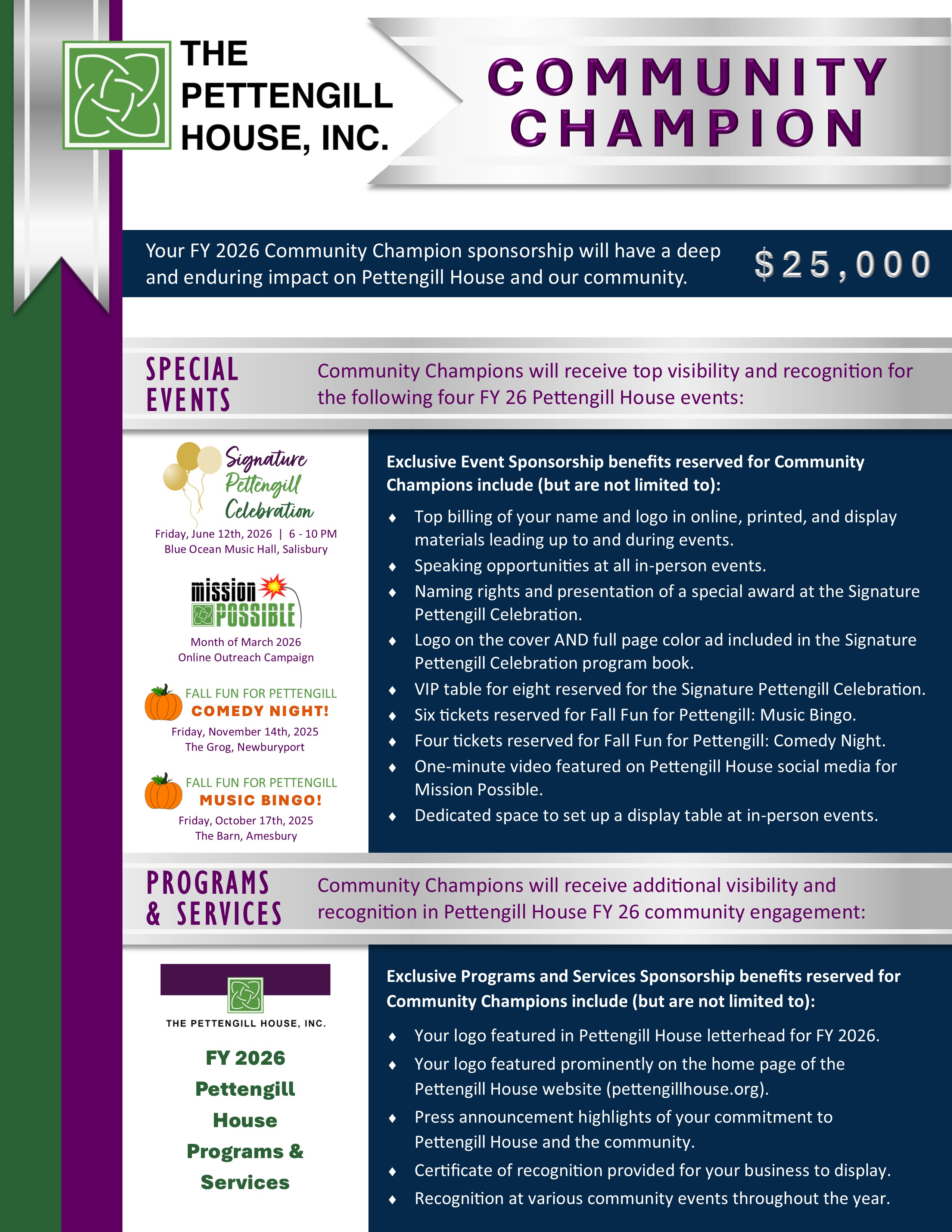 Invest in the well-being of our community while highlighting your brand. Please scroll down to explore our FY 2026 events and sponsorship opportunities. For questions, please contact Sierra Partlan, Director of Development & Programs at spartlan@pettengillhouse.org.